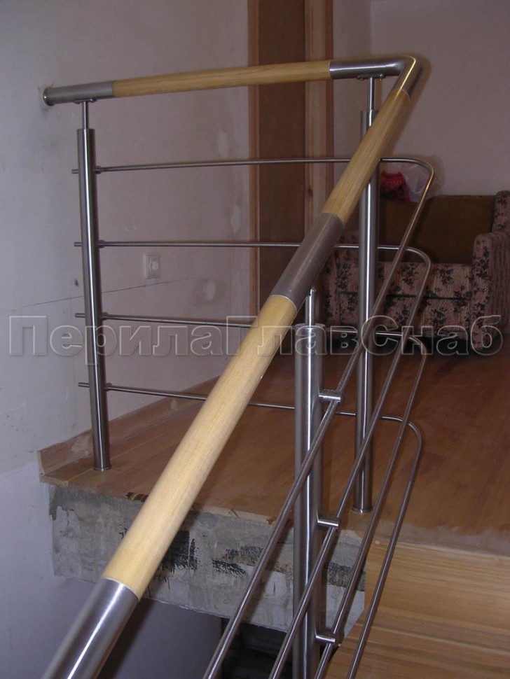 Нержавеющие ограждения без ригелей с круглым поручнем и стойками с деревянными вставками