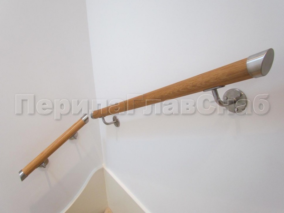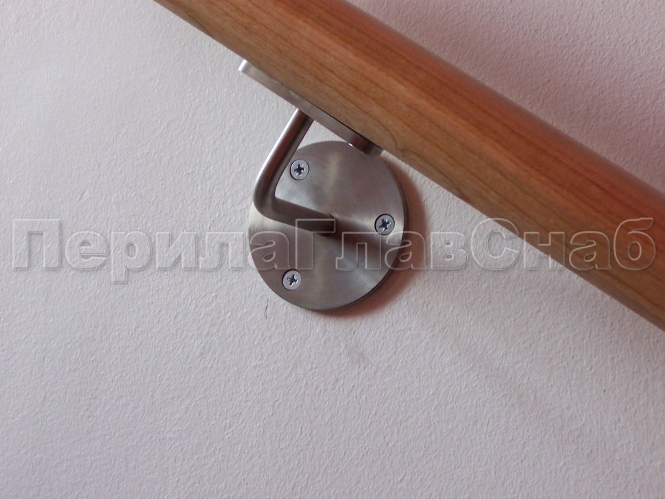 При завязке пристенного поручня с поручнем основных ограждений можно использовать специальные деревянные сегменты, которые крепятся к поручню через штифт + клей + специальное нержавеющее соединительное кольцо. Дешевле использовать шарнирные повороты. Надежнее использовать нержавеющие отводы, которые через саморез крепятся к поручням.