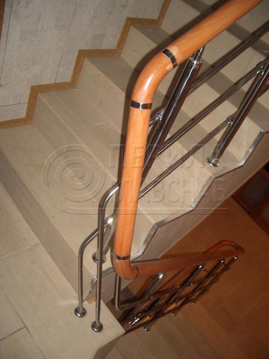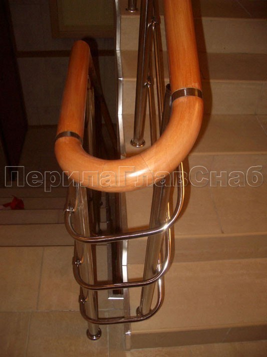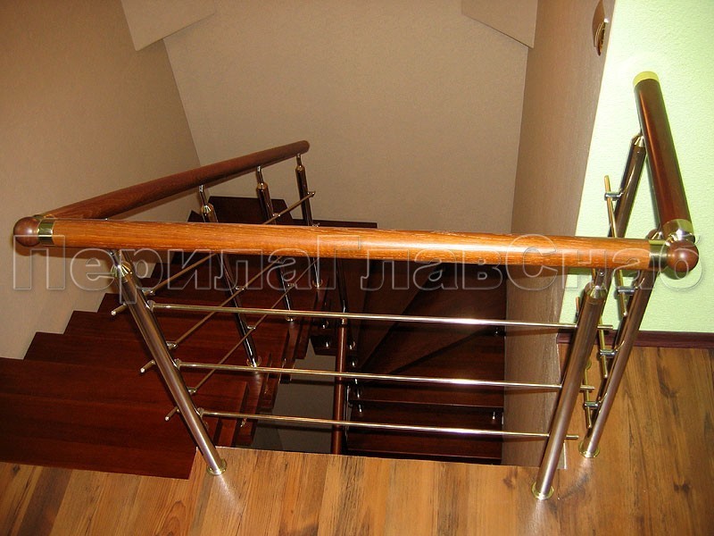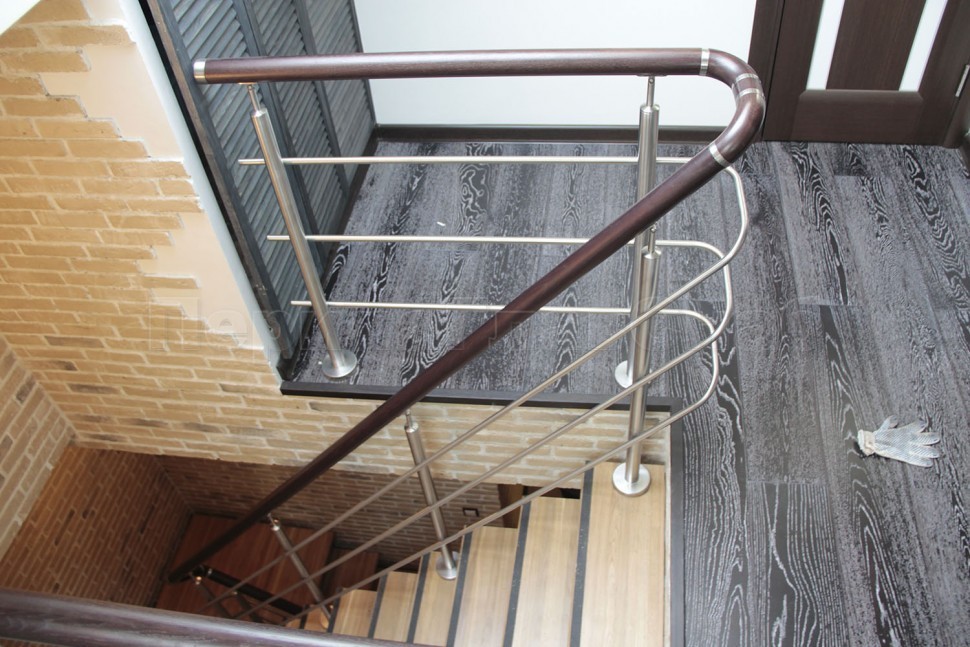 Три ригеля на сварке, квадратный деревянный поручень и круглые стойки