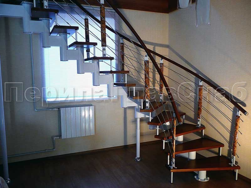 Три ригеля на сварке, квадратный деревянный поручень и круглые стойки