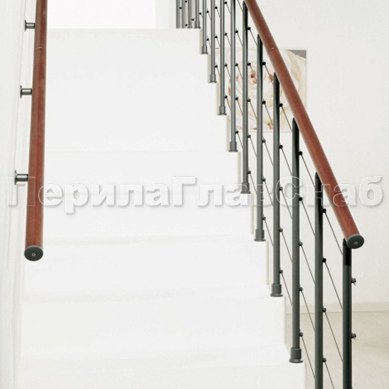 Два ригеля на держателях, круглый деревянный поручень и круглые стойки