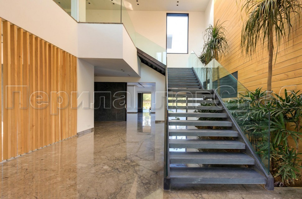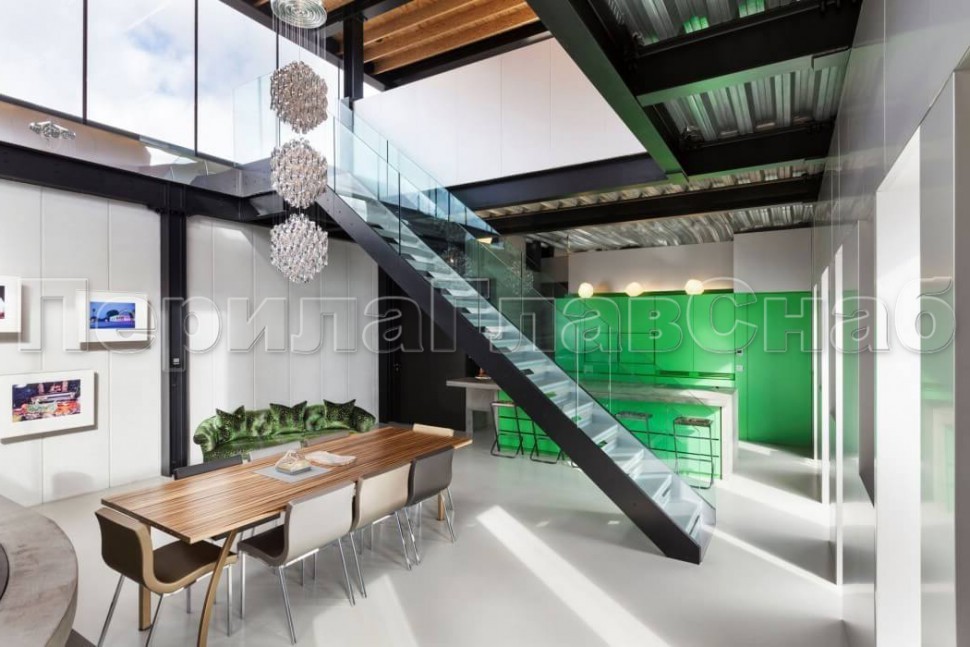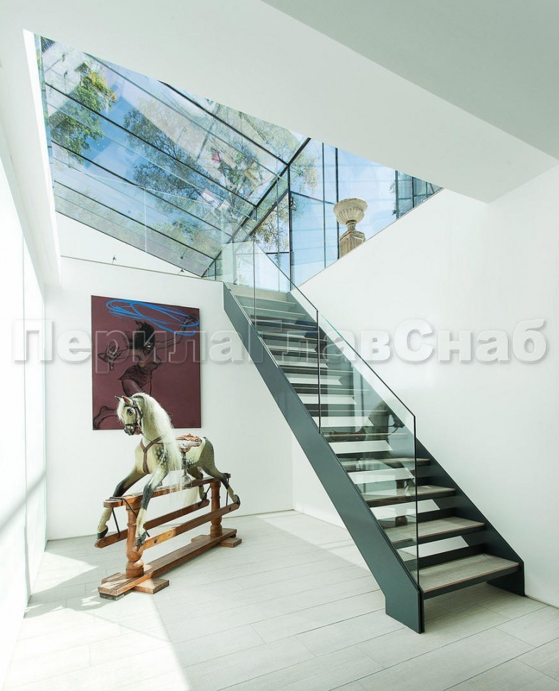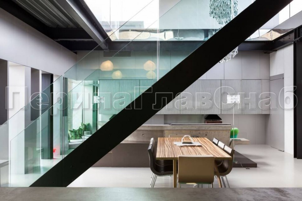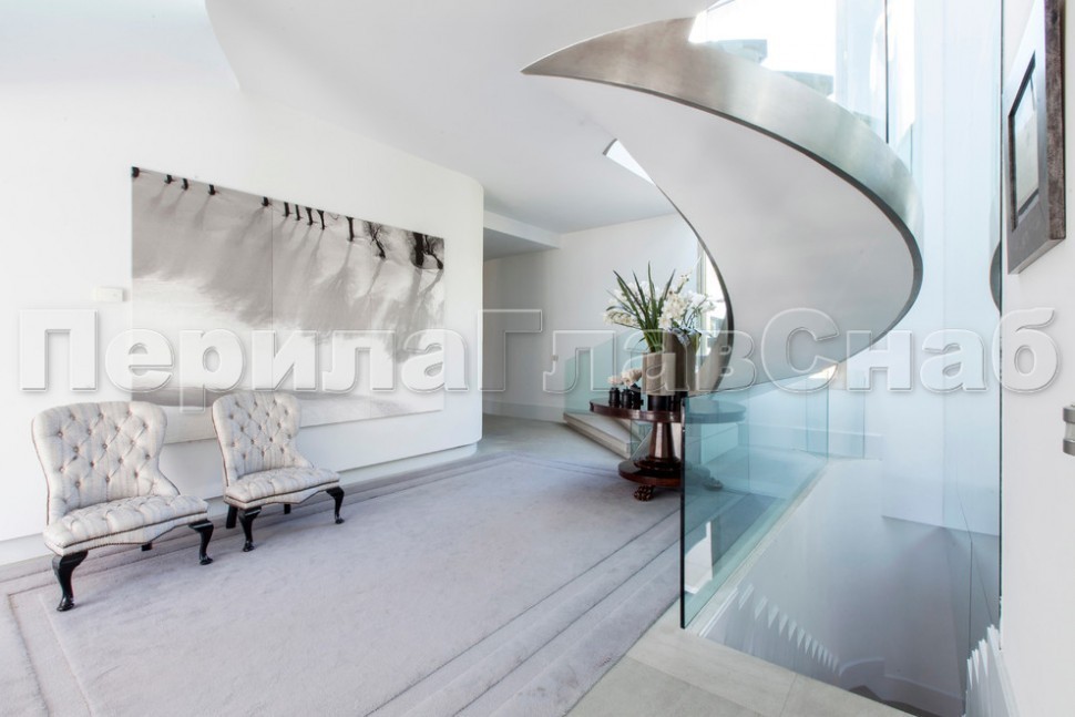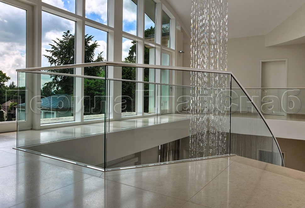 Ограждение с профильным поручнем с пазом на точечном креплении на лестнице