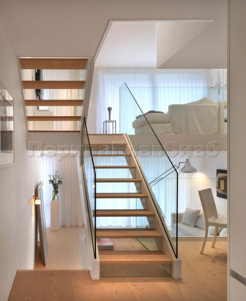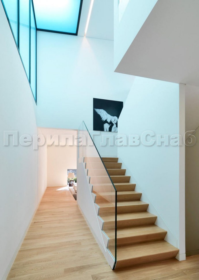 Ограждение с деревянным поручнем на точечном креплении на лестнице