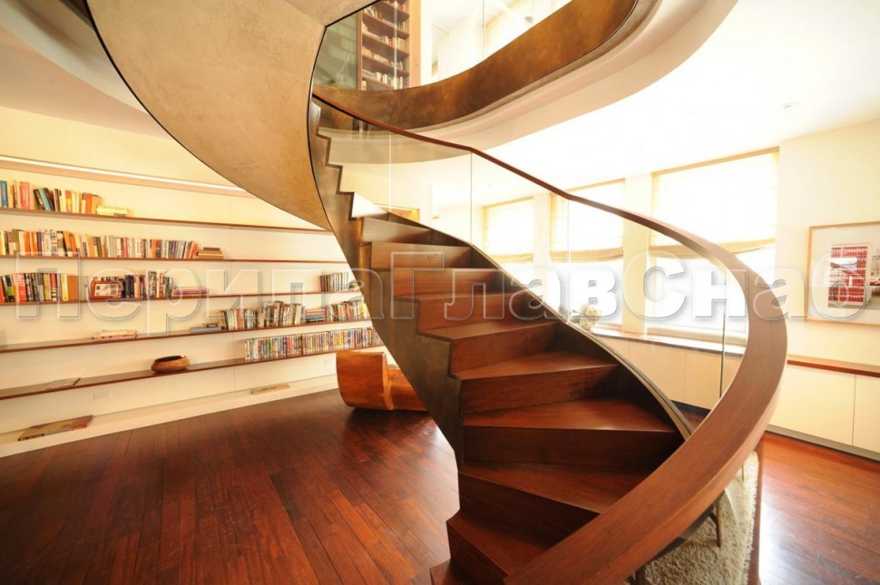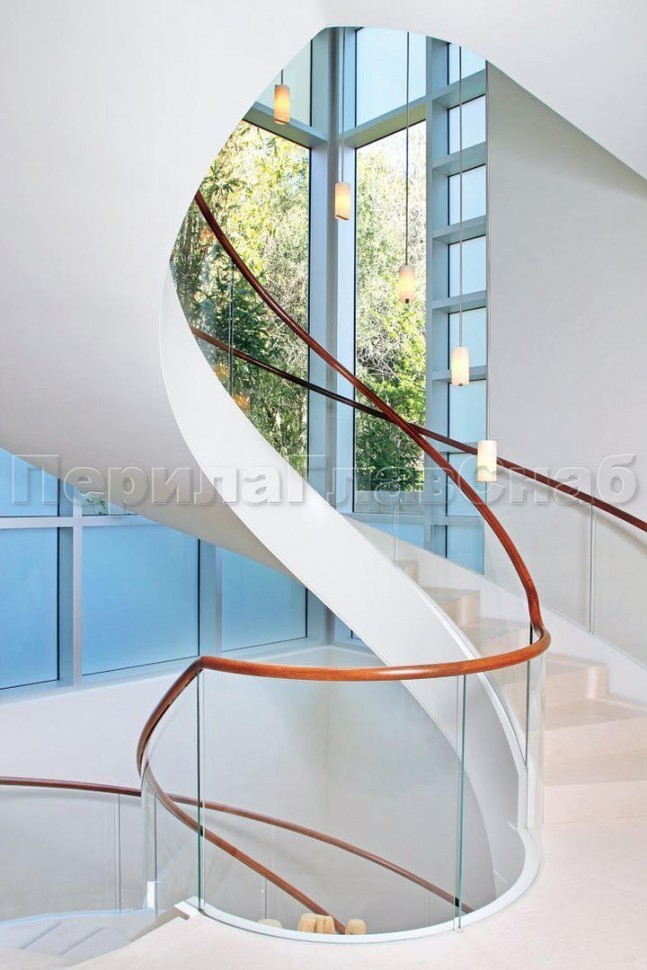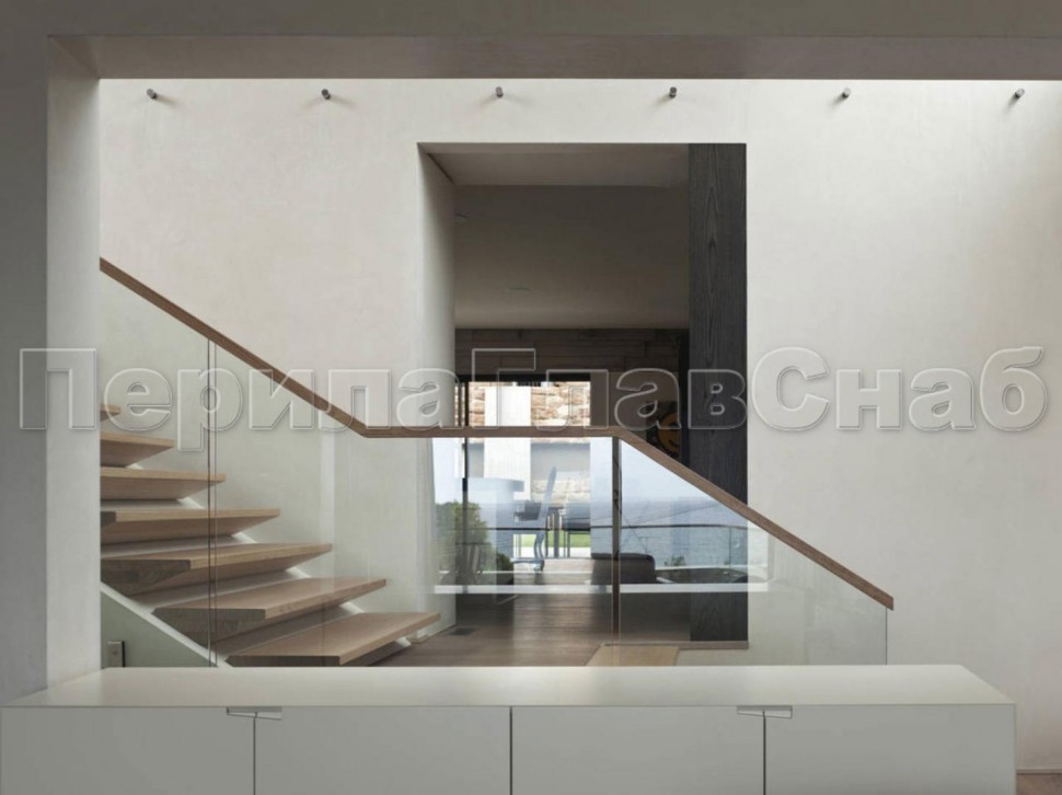 Ограждение с деревянным поручнем на точечном креплении на лестнице