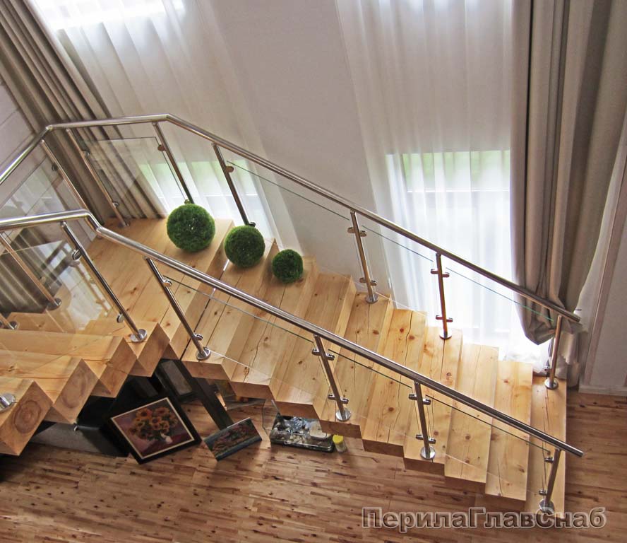 Ограждение с деревянным поручнем с зажимными стеклодержателями и стойками в Уфе. Готовые проекты ПерилаГлавСнаб