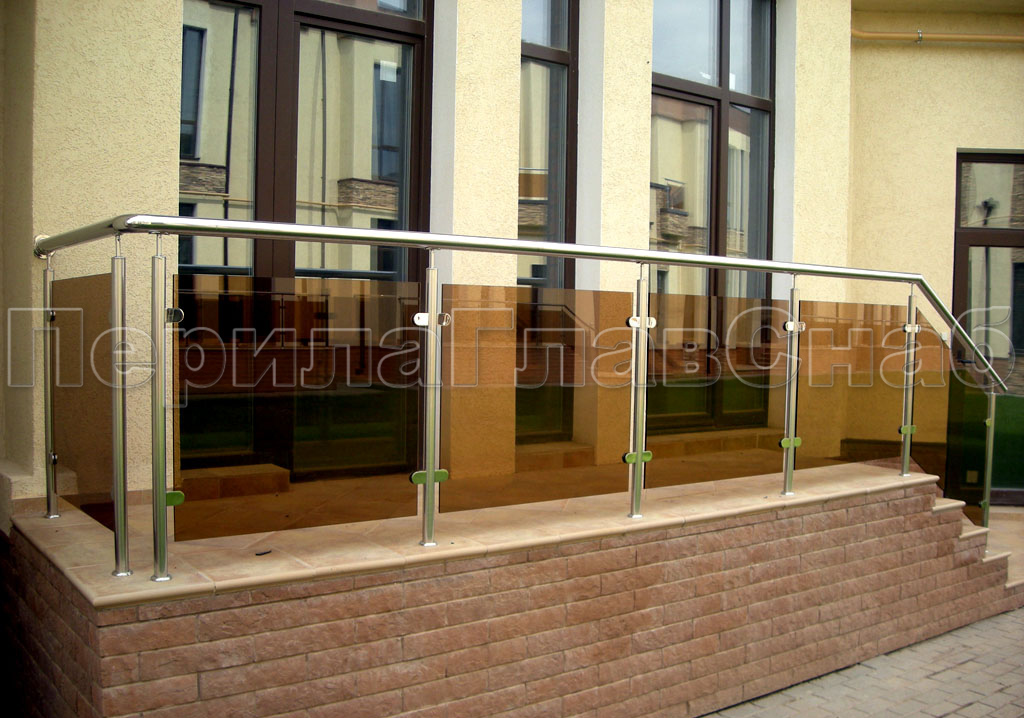 Ограждение для лестницы из нержавейки с зажимными стеклодержателями для крыльца в Уфе. Готовые проекты ПерилаГлавСнаб