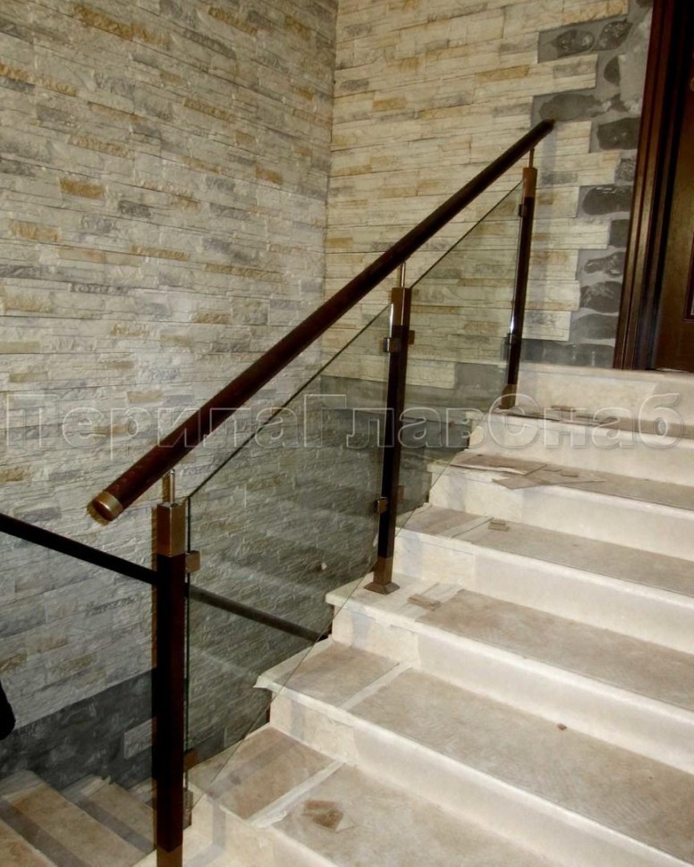 Ограждение с круглым деревянным поручнем с зажимными стеклодержателями и стойками с деревянными вставками