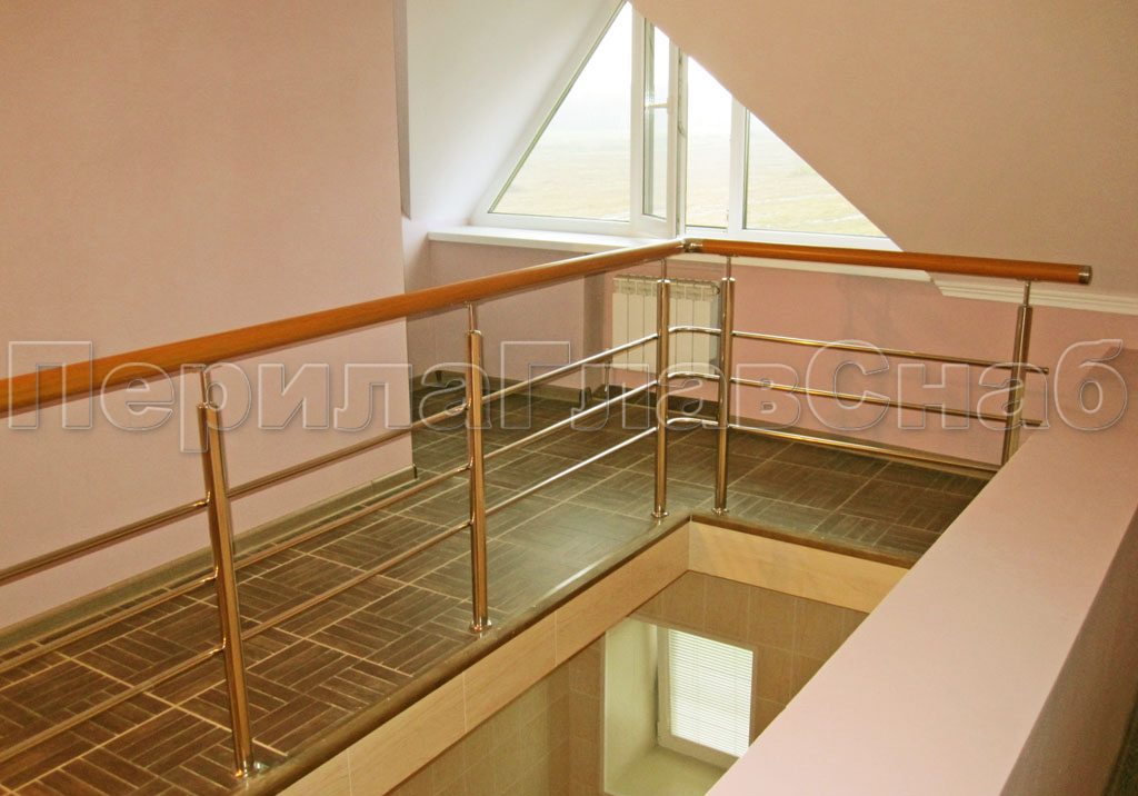 Три ригеля на сварке, квадратный деревянный поручень и круглые стойки
