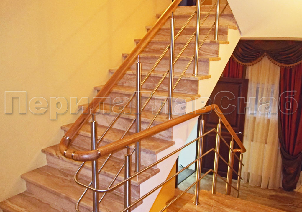 Три ригеля на сварке, квадратный деревянный поручень и круглые стойки в Уфе. Готовые проекты ПерилаГлавСнаб