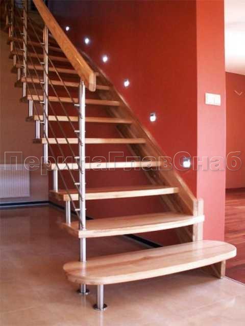 Ограждения с двумя стойками в каждую ступень с деревянным поручнем и без ригелей