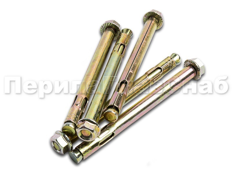 Анкер болт с гайкой представляет собой сложное крепежное изделие, которое состоит из втулки(внешней оболочки), шпильки с распором с конусом на конце и гайки-прокладки с запрессованной шайбой. При монтаже анкерного болта с гайкой, шпилька выступает за края анкера, и увеличивает его общую длину, а при закручивании гайки, шпилька с распором перемещается в сторону гайки, расклинивая втулку (внешнюю оболочку), которая и упирается в стенки отверстия, обеспечивая надежность крепления.