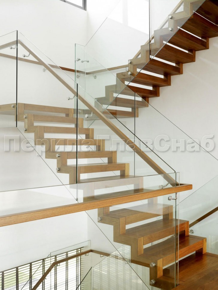 Ограждение с деревянным поручнем на выносе на точечном креплении на лестнице