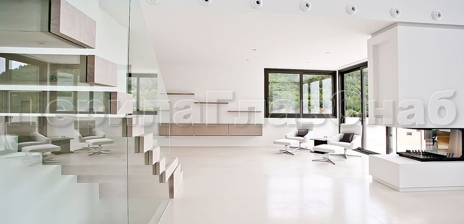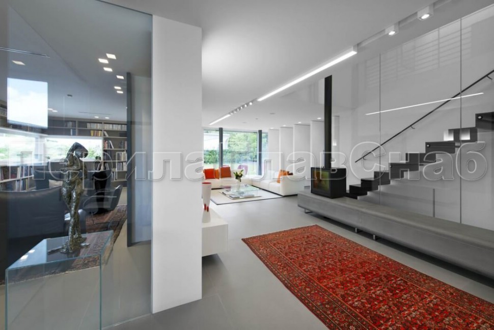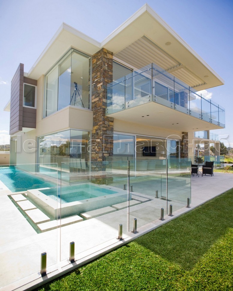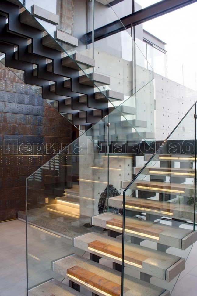 Красивая опция - частичная матировка нижней части несущего стекла (делают обычно там, где стекло примыкает к лестничному маршу или перекрытию).