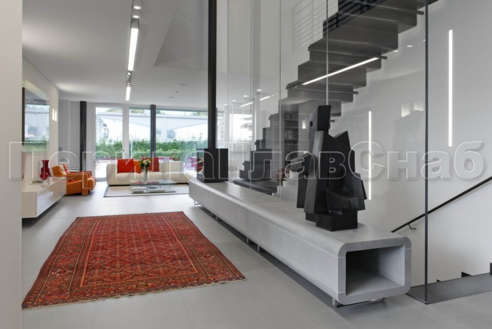 Ограждение с профильным поручнем с пазом на точечном креплении на лестнице