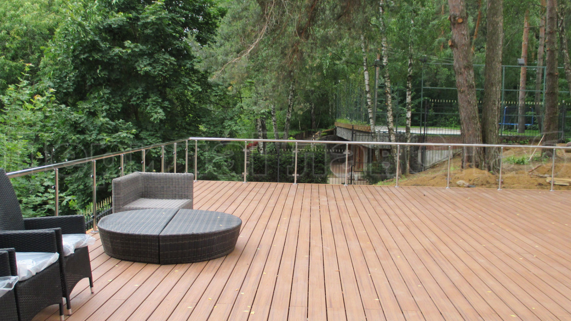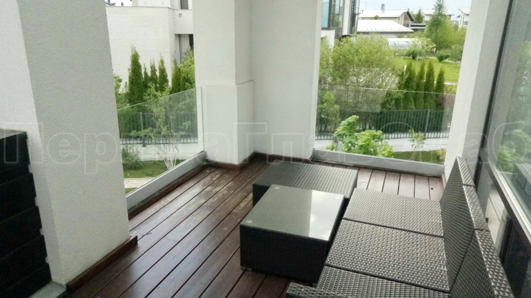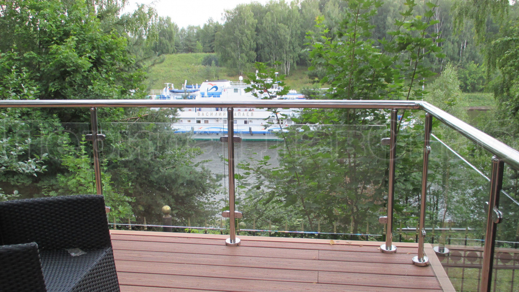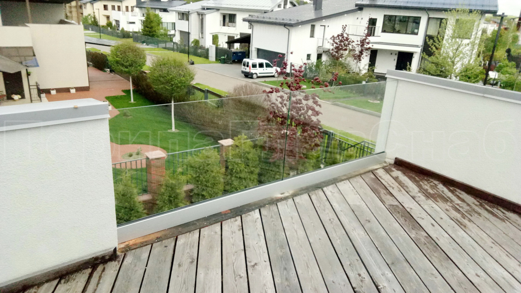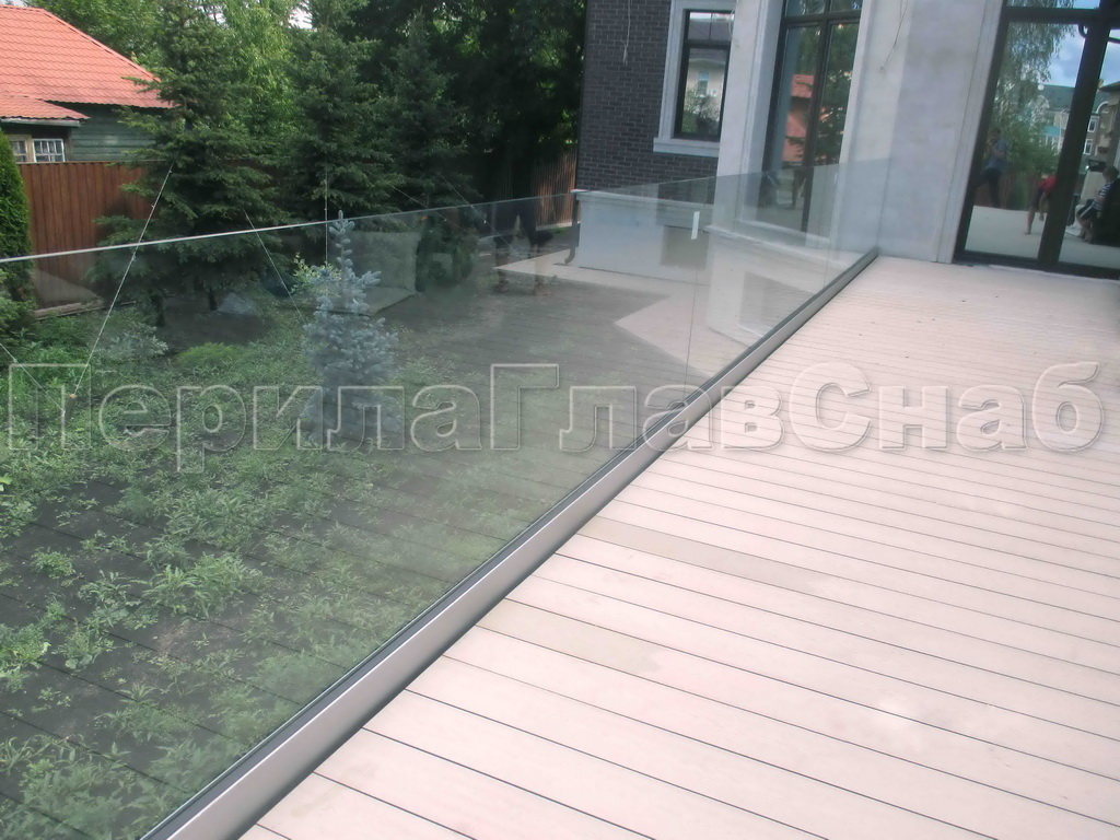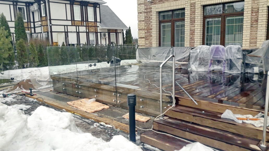 В большинстве проектов стеклянные ограждения устанавливаются на террасную доску. Как правило, террасная доска укладывается за металлический каркас. Для того, чтобы крепление стекла в виде стоек из нержавеющей стали было крепким, мы настоятельно рекомендуем до укладки террасной доски установить закладные элементы - шпильки. Закладные элементы стеклянных ограждений для террасы привариваются к существующему металлокаркасу или устанавливаются на бетонное основание. После этого укладывается террасная доска с выводом закладных элементов через доску. Если стеклянное ограждение монтируется в зажимной профиль, то для надежной установки профиля по всей его длине под террасную доску мы дополнительно монтируем профильную трубу. Именно к ней через доску будет смонтирован профиль для стеклянных ограждений террасы. Высота профиля составляет около 100мм. Если Вы не хотите, чтобы профиль был визуально виден, то мы можем первым этапом смонтировать профиль для стеклянных ограждений, далее вы укладываете террасную доску, закрывая высоту профиля, а после этого мы устанавливаем уже стекла. Даже если ваша терраса полностью готова и доска уже лежит – не переживайте, вызывайте нашего специалиста на объект. Мы обязательно предложим Вам надежное техническое решение для установки стеклянных ограждений террасы.