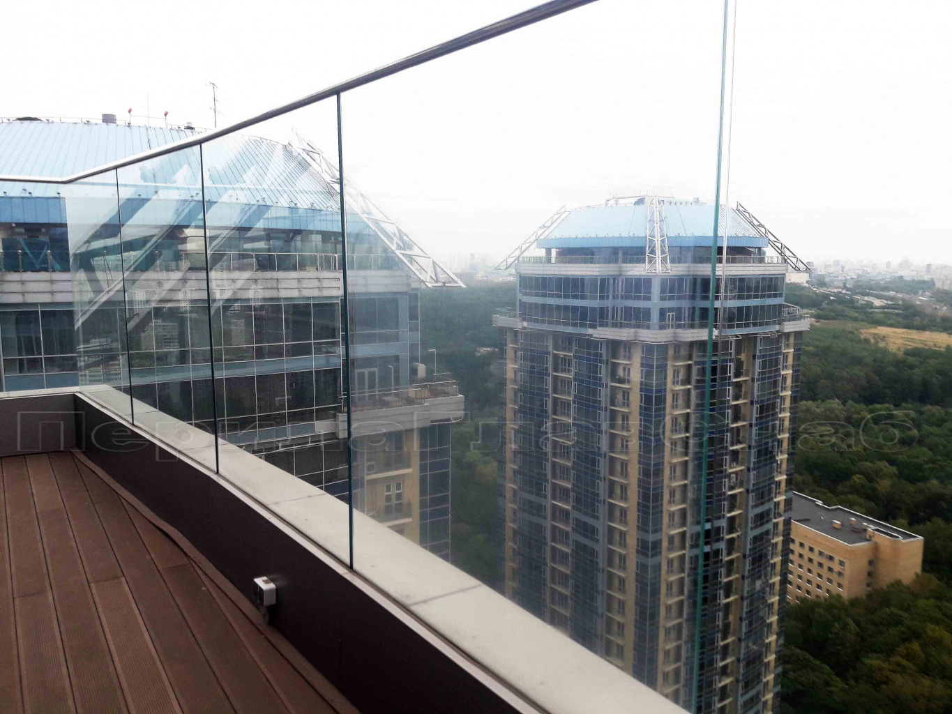 Подумайте, какой сценарий пользования террасой? Если это открытая терраса-балкон и по ней будут бегать дети или ходить члены семьи и гости, то наверняка им захочется подойти и облокотиться на стеклянные ограждения. Конечно, в таком случае поручень, установленный сверху на стекло или на выносе просто необходим. Другим незыблемым преимуществом установки поручня является то, что поручень делает всю конструкцию перил из стекла жесткой, связывает ее. В качестве альтернативы поручню мы можем предложить П-образный изящный профиль из нержавеющей стали. Он монтируется на верхнюю кромку стеклянных ограждений террасы, тем самым защищает кромку стекла и связывает все полотна стекол между собой.